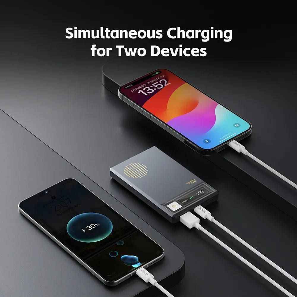 ظاهر این پاوربانک واقعاً جلب توجه میکند. بدنهای شفاف که اجزای داخلی را نمایش میدهد، صفحهنمایشگر دیجیتال هوشمند برای نشان دادن میزان شارژ، و رنگهای خاکستری تیره و تیتانیوم جذاب، طراحی مدرن و لوکسی را ارائه میدهند. وزن سبک حدود ۲۱۵ گرم و ساختار باریک باعث میشوند بتوانی آن را بهسادگی در کیف یا جیب خود حمل کنی بدون اینکه سنگینی حس کنی.